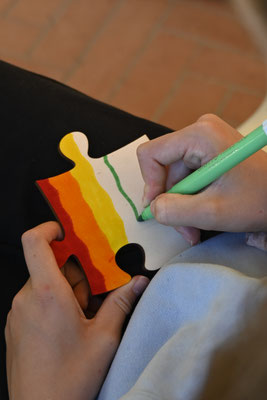 Im letzten Block gestalteten die Teilnehmenden ein Puzzleteil, das am Schluss zusammengesetzt ein wunderschönes Bild ergab. Als Abschluss des Camps gestalteten die Leitenden einen Abend mit lustigen Challenges, Musik und ganz viel Lachen. Müde aber glücklich ging es dann am Samstag-Morgen nach kurzem putzen der Bungalows auf die Heimfahrt.